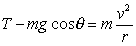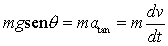 El peso W puede descomponerse en la dirección radial, mg cosq, y tangencial, mg senq. Las ecuaciones de Newton en la dirección radial y tangencial son: