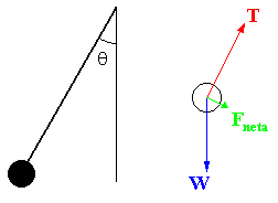 Un péndulo consiste de una cuerda sujeta en un extremo y una masa atada en el otro extremo. Las únicas dos fuerzas que intervienen sobre la masa son la gravedad y la tensión de la cuerda. La fuerza resultante sobre el péndulo no es constante debido a que la tensión de la cuerda depende del ángulo respecto a la vertical y a la velocidad de la masa. El movimiento que describe el péndulo es un movimiento circular con rapidez variable. La figura 1 muestra el diagrama de cuerpo libre del péndulo.